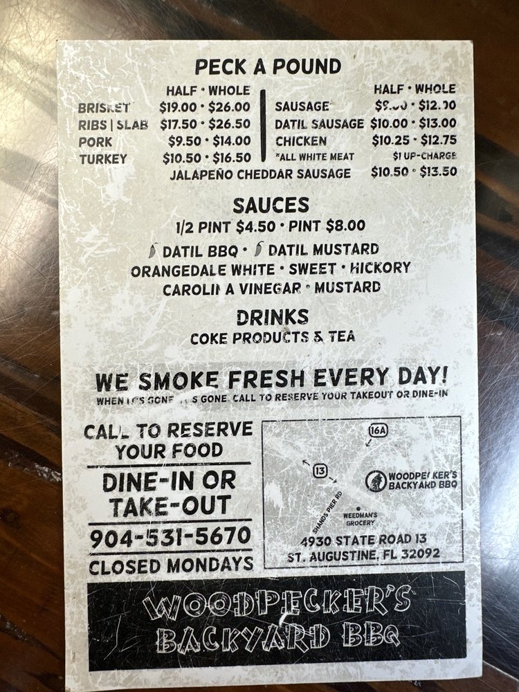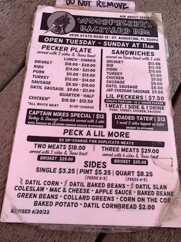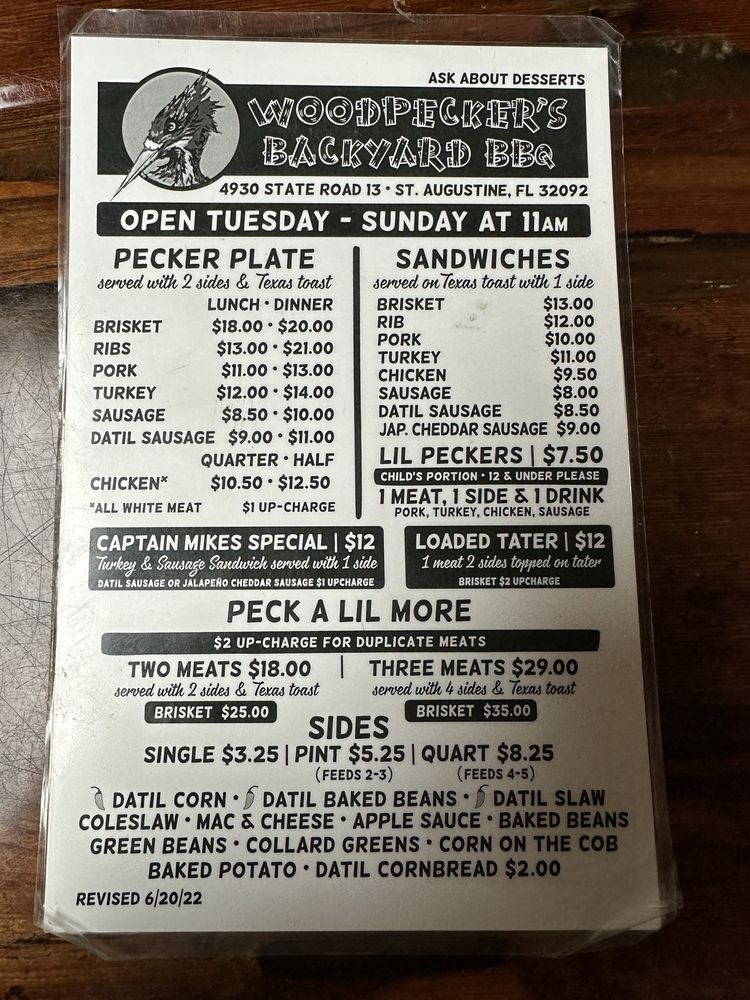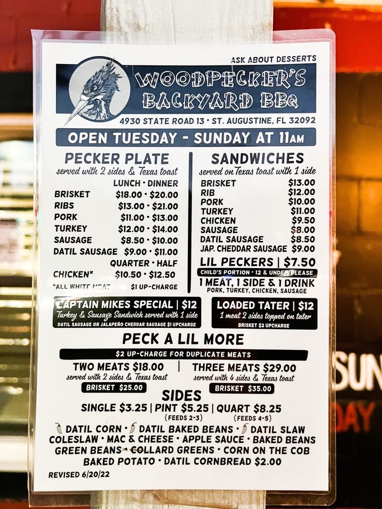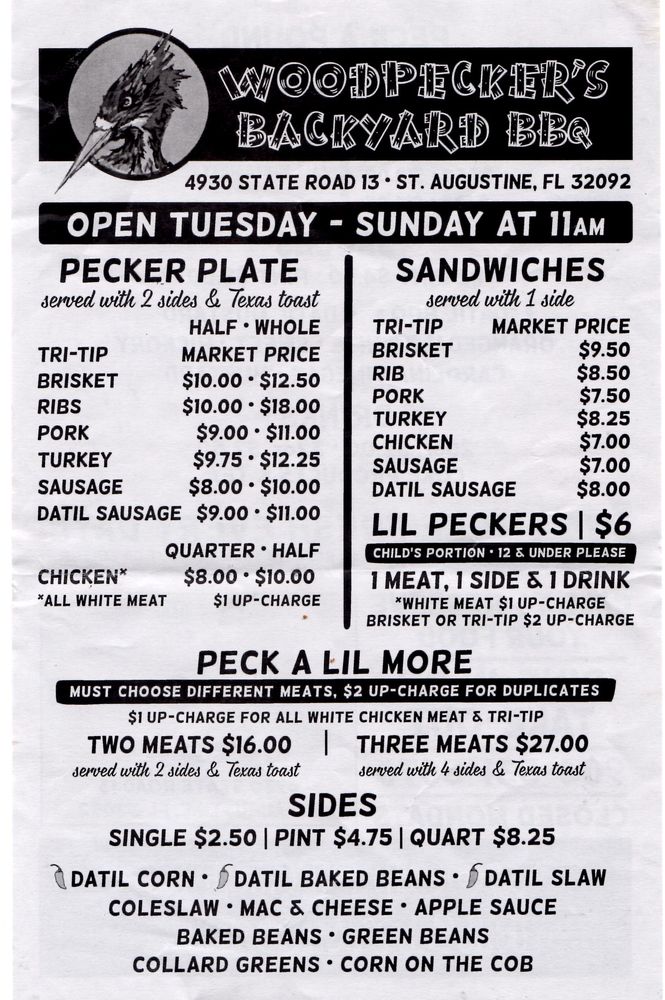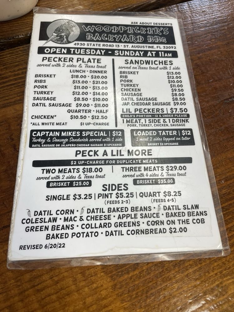 Woodpeckers Backyard BBQ is a must-visit spot in Saint Augustine, FL for BBQ enthusiasts. The restaurant offers a range of amenities including takeout, vegan options, outdoor seating, and happy hour. Customers rave about the friendly service, delicious smoked meats, and welcoming atmosphere. The menu boasts items like ribs, brisket, and delectable sides like baked beans and coleslaw. Woodpeckers' consistency and quality have garnered a loyal following, with patrons coming back for more each time. From the savory meats to the flavorful sides, every dish at Woodpeckers is a treat for the taste buds. Don't miss out on the opportunity to savor the mouthwatering BBQ offerings at Woodpeckers Backyard BBQ.